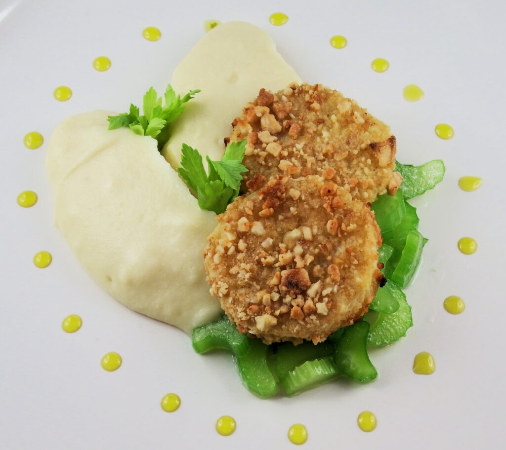 Das restliche Drittel der Äpfel in den Mixer geben, Zitronensaft hinzufügen und pürieren. Von der Semmel, oder dem Baguette dünne Scheiben schneiden und im Rohr goldbraun rösten.