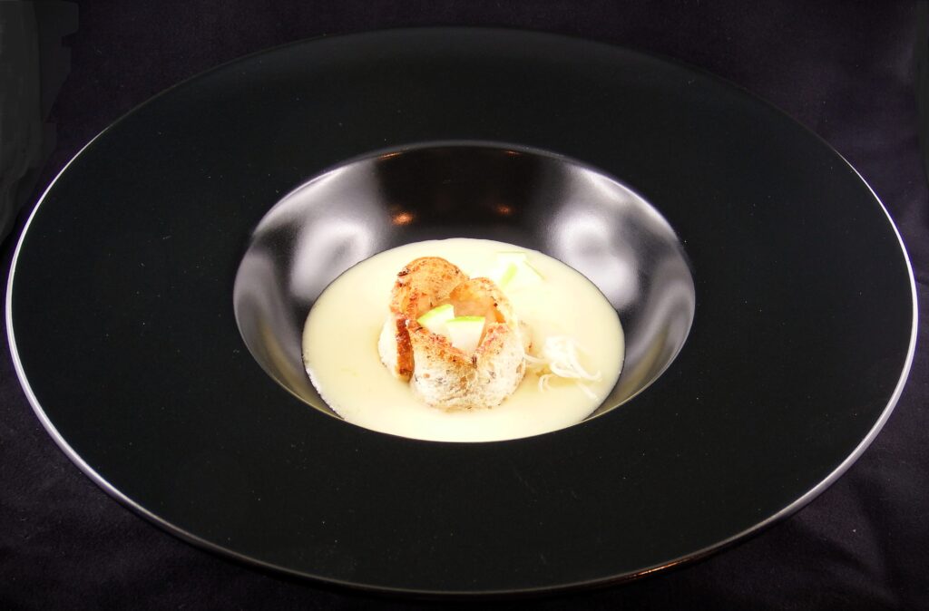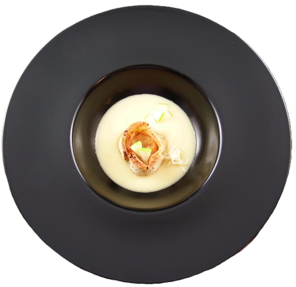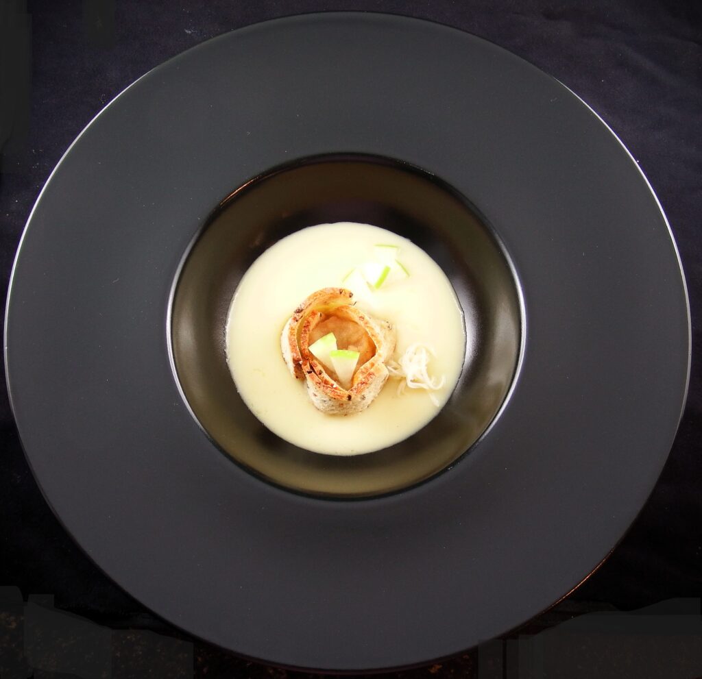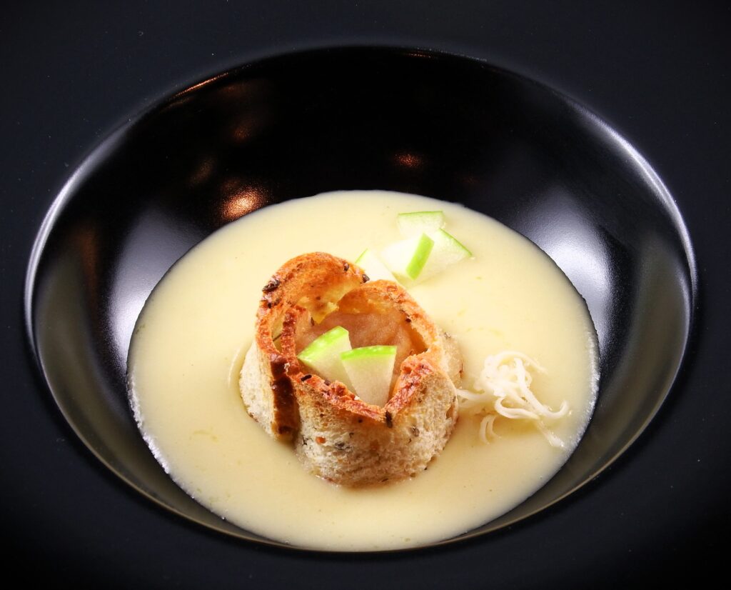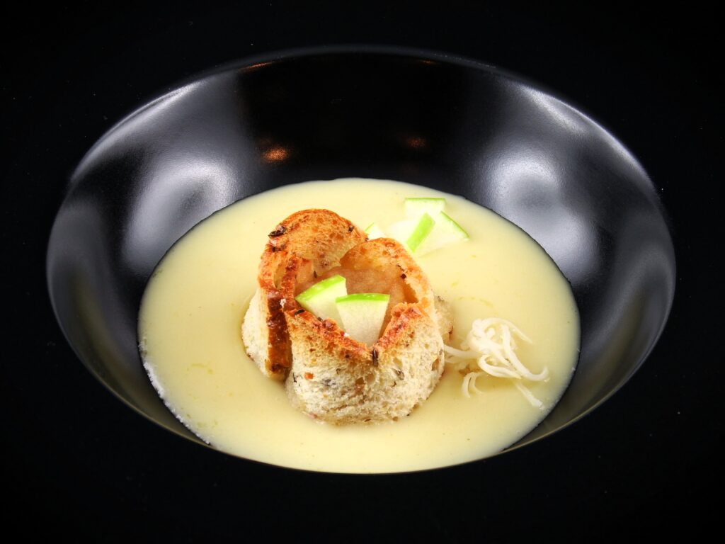 Die Suppe in Teller füllen, das geröstete Brot in die Mitte legen, die Apfelcreme darauf anrichten, mit frischen Apfelspalten garnieren und servieren.