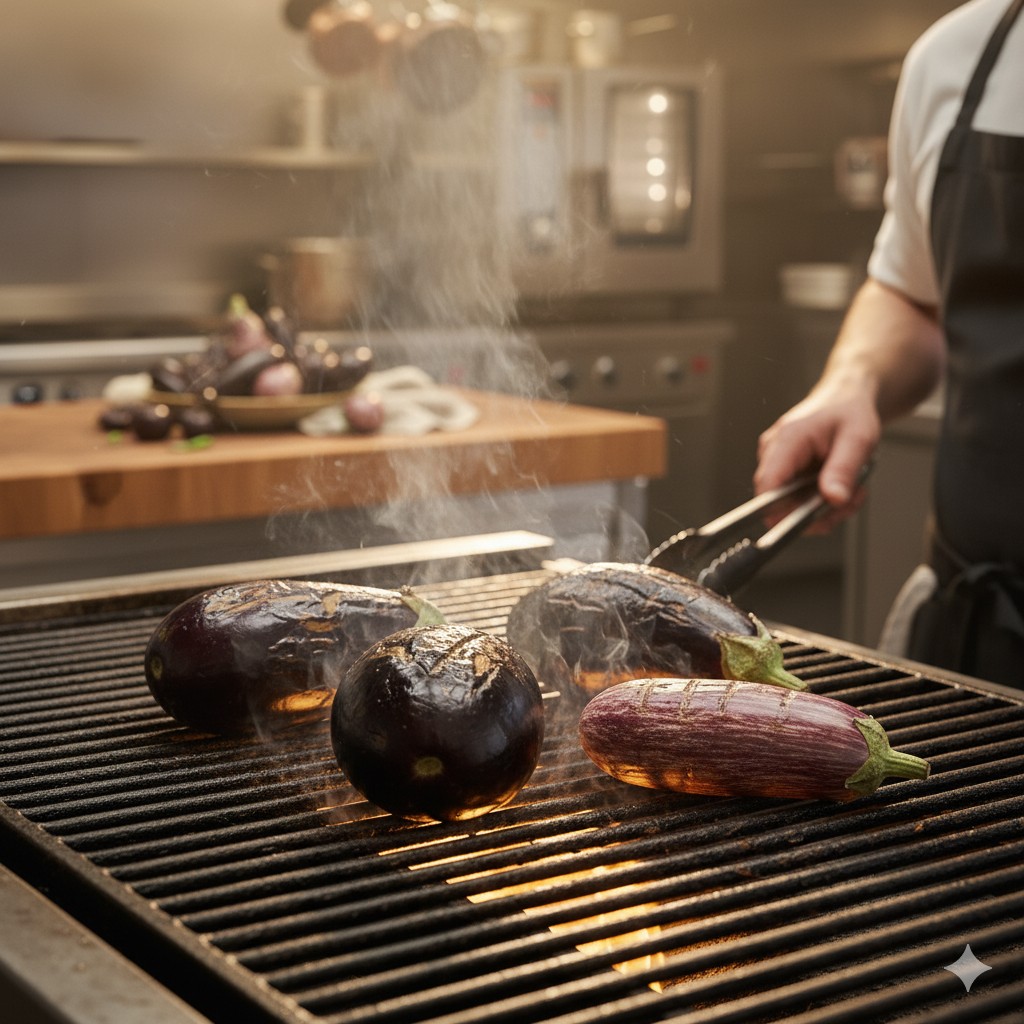 Die Melanzani ganz auf den Grillrost legen und unter ständigem Drehen von allen Seiten stark grillen. Sie ist fertig, wenn die Schale knusprig und fast verkohlt ist. Dann vom Grill nehmen, 10-15 Minuten stehen lassen, damit die Feuchtigkeit austreten kann und sie etwas abkühlt.