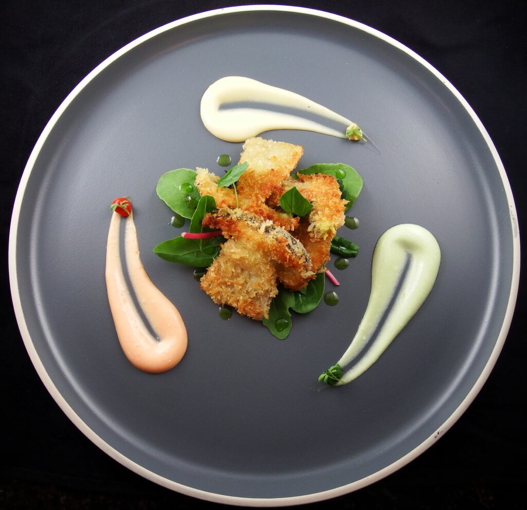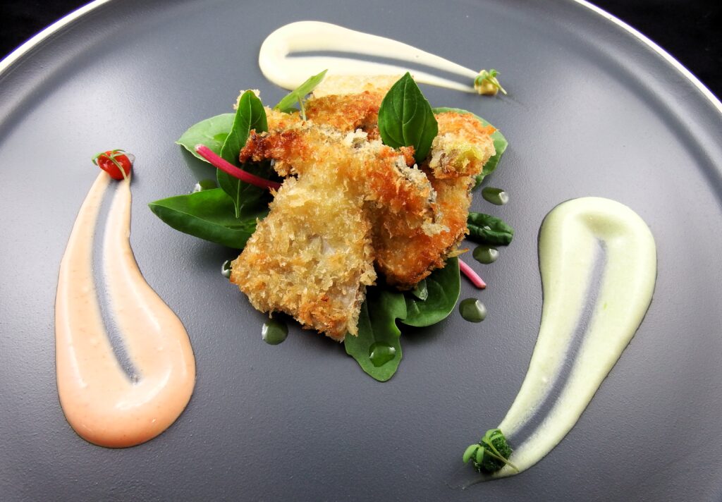 Einige Salatblätter in die Mitte eines Tellers geben und mit Olivenöl beträufeln. Die gebratenen Steinpilze darauf legen und mit je einem Löffel roter, gelber und grüner Mayonnaise garnieren.