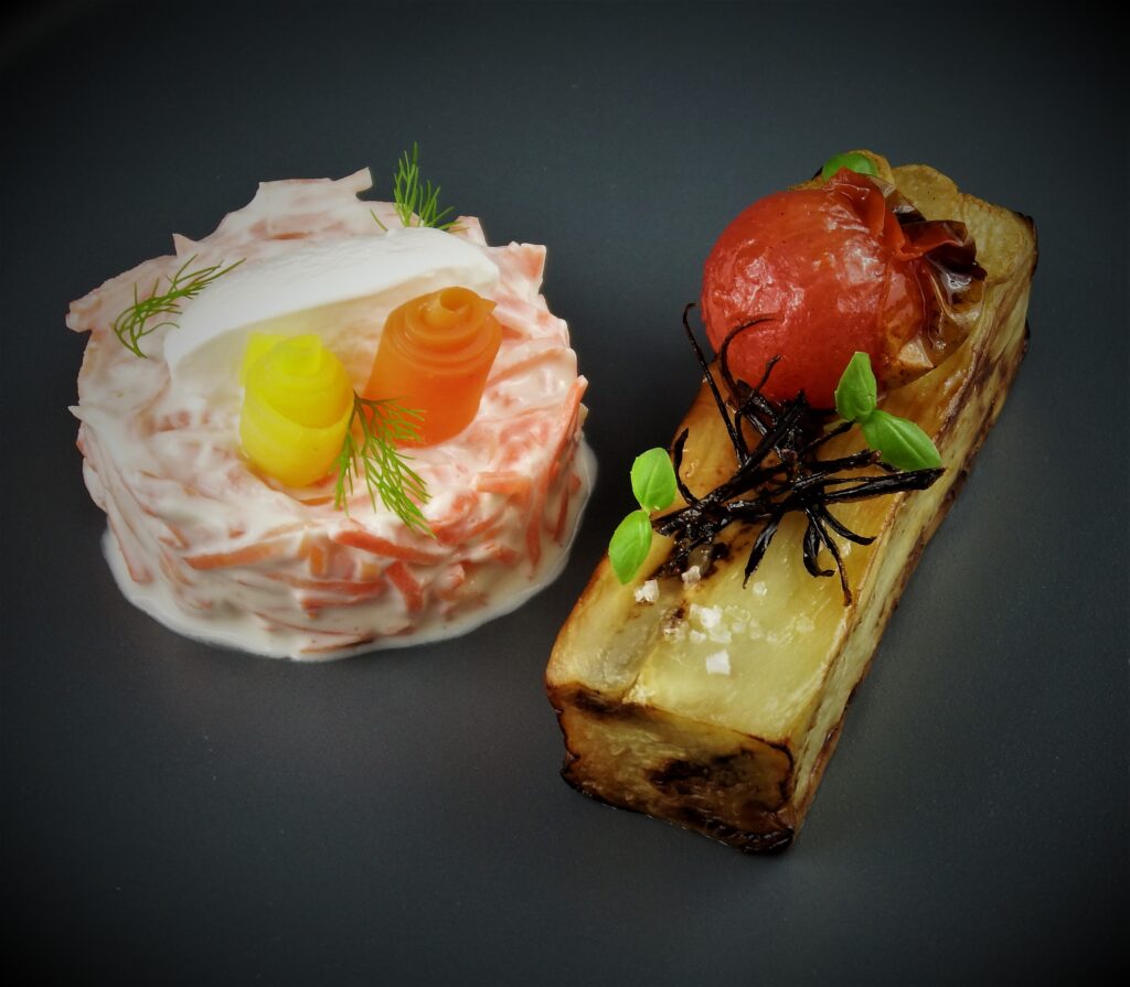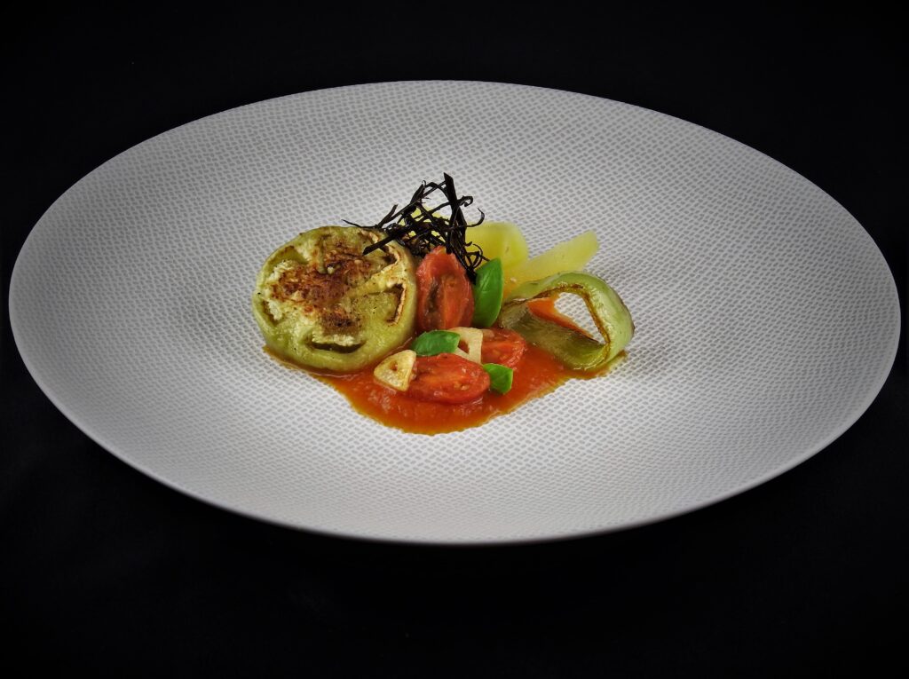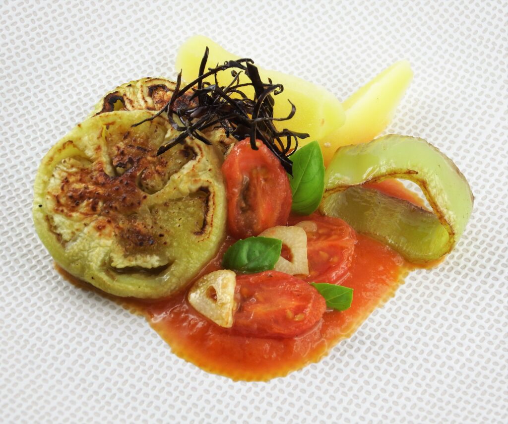 Das fertige Letscho auf einen Teller geben, die gegrillten Auberginenscheiben darauf legen und mit gerösteten Knoblauchscheiben, Basilikumblättern und der knusprig gebackenen Melanzanischale garnieren.
