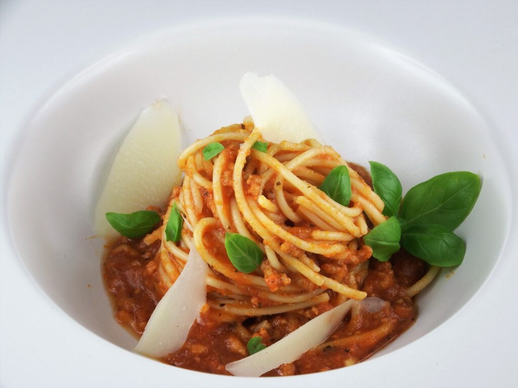 Dann die vorbereitete Tomatensoße hinzufügen und kurz aufkochen lassen. Nach Bedarf mit Salz abschmecken.