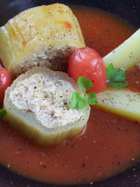 Von den Tomaten 3-4 Stück beiseite legen, die restlichen Tomaten zu den angebratenen Zwiebeln geben, salzen, Knoblauch hinzufügen und bei mittlerer Hitze weich kochen. Wenn dabei Flüssigkeit verdunstet, etwas Wasser hinzufügen. Wenn die Tomaten ganz weich gekocht sind, nehmen wir sie vom Herd, geben sie in einen Mixer und mixen sie cremig.