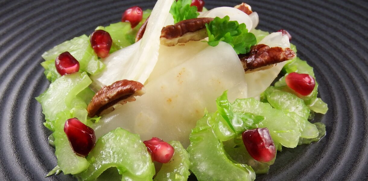 Sellerie Carpaccio mit Granatapfel und Pekannüsse