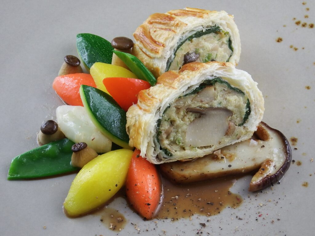 Steinpilz-Wellington mit gedünstetem Gemüse