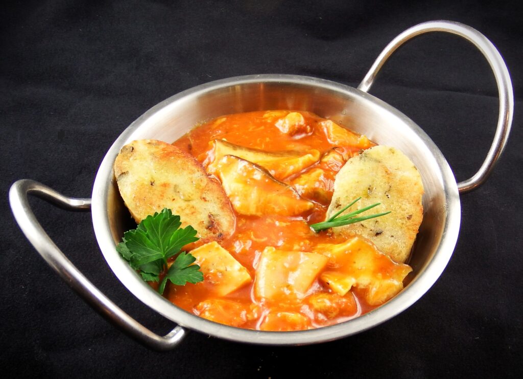 Stichwörter: Steinpilz, Paprika, Zwiebel, Knoblauch, Serviettenknödel