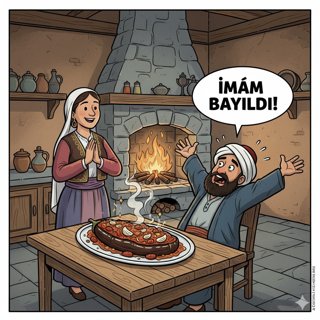 Einst lebte ein armer, aber sehr frommer türkischer Imam, der Melanzani sehr mochte. Seine Frau, eine geschickte Köchin, bereitete eines Tages dieses Gericht für ihn zu. Für die Füllung verwendete die Frau die letzten drei Flaschen Olivenöl des Imams. Das Gericht war so köstlich, dass der Imam eine große Portion davon aß.