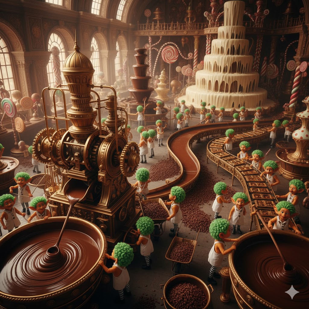 Die beste Schokolade der Welt wird in einer geheimen Ecke, versteckt vor neugierigen Blicken und vor allem vor Industriespionen, in Willy Wonkas Fabrik hergestellt. In der Vulkanrösterei werden die aromatisierten Kakaobohnen in tropischer Hitze von fleißigen Oompa Loompas gemahlen, zermahlen und zu einer cremigen Masse gepresst, damit diese in den Schokoladenwasserfällen ihre unnachahmliche Seidigkeit erlangt. Über Schokoladenflüsse gelangt sie dann in die Weiterverarbeitungsanlagen, wo sie temperiert, aromatisiert, portioniert, verpackt und in die besten Schokoladenläden der Welt verschickt wird. Da Schokolade die einzige, liebste und unersetzliche Nahrung der Oompa Loompas ist, ist dies allein schon eine Garantie für perfekte Qualität. Aber das muss ich niemandem sagen, der jemals eine Wonka-Schokolade probiert hat – genauso wenig wie ich erklären muss, dass Haarspray die Haare fixiert. 😉
